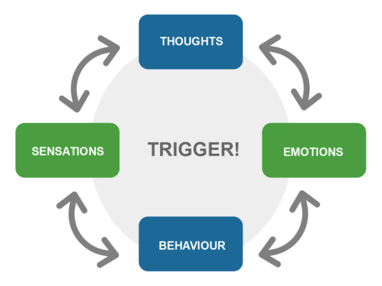 CBT is based upon the idea that our thoughts, not external events like people or situations, are actually the cause of our feelings and behaviours.